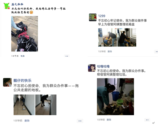 帮武昌校区退休老教师送午餐、打扫宿舍集体区域卫生、帮宿管阿姨整理宿舍垃圾、清扫教学楼教室卫生、清理宿舍区域小广告、整理学校摆放无序影响校园环境的自行车、帮助食堂阿姨回收餐盘……等等一件件小事,聚少成多,聚沙成塔,形成集群效应,向武昌校区展示了土建学院学生党员和积极分子的担当。