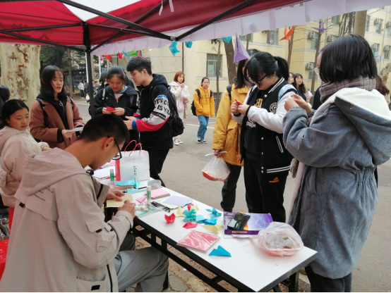 志愿者们在这次活动中充分诠释了“奉献,友爱,互助,进步”的志愿奉献精神。志愿者们会赠送千纸鹤、小船、百合花、爱心等等精致美丽的造型给心怀感恩之情的同学们写出他们心底的感恩话语,并邀请参与者在两天之内投入5栋的119邮箱中,同时也会亲手帮助同学们邮寄出去,传达他们的感恩之心。些许的功夫,主题板上就被各式各样的折纸贴满了,拉远看折纸的补充让主题板充满感恩画意;放大镜头,折纸上的一行行字透露着对亲人,朋友……以及这个世界的暖暖谢意。