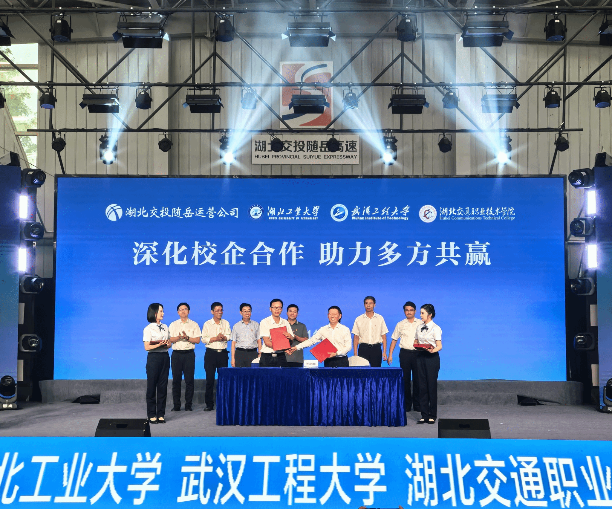 在校企合作签约仪式上,学院院长刘章军代表学校与湖北交投随岳运营公司负责人签订《共建实习和劳动实践基地协议书》。