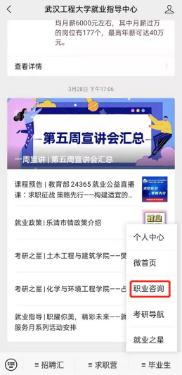 关注并进入公众号“武汉工程大学就业指导中心”,或扫描下方二维码进行关注。