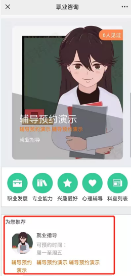 进入公众号后,点击界面右下角“毕业生”-“职业咨询”,进入职业咨询界面,此时可左右或上下滑动,查看咨询老师的相关信息即可预约时间,至少提前三天预约。