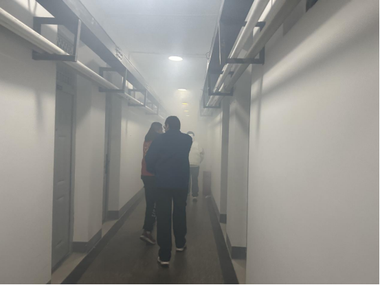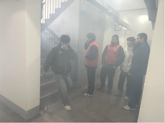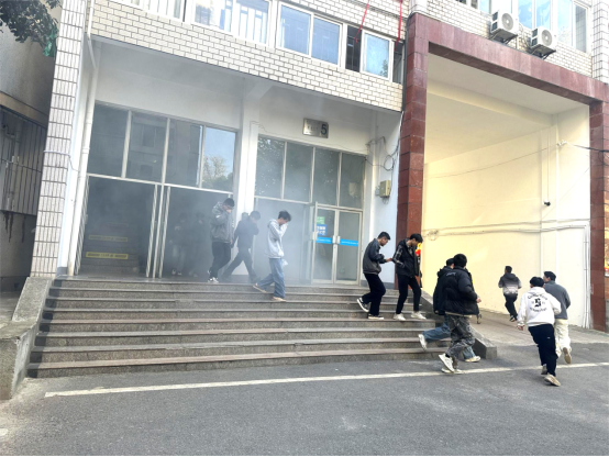 14点30分,随着急促的警报声骤然响起,释放烟弹,一场模拟火灾的紧急疏散演练正式拉开帷幕。辅导员和志愿者们按照既定计划迅速到班到岗,有条不紊地指挥学生按照预定路线进行疏散。学生们猫着腰,用手、袖口或湿巾紧紧捂住口鼻,以最快的速度撤离到安全区域,各班级迅速清点、统计人数,汇报疏散情况,确保不漏一人,整个疏散过程高效有序。