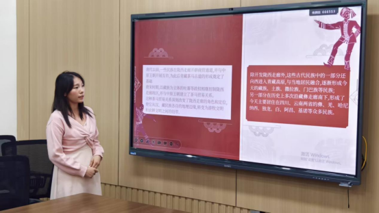 来自23级的殷雨萱同学,她向我们介绍了民族团结的内涵和意义,然后通过讲述被评为全国道德模范的王燕娜无偿为新疆18岁维吾尔族学生捐献肾脏的故事向我们展示了新时代的雷锋精神和令人动容的民族团结精神。她还通过讲述去年爆火全网的哈尔滨与全国各地互送特产的事情让我们看到了不同的地域特色以及民族之间的交流与团结。