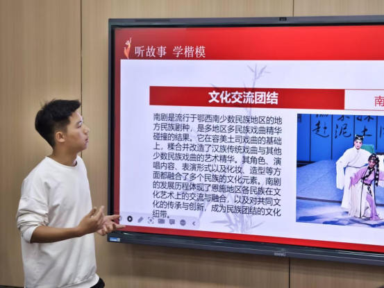 来自2024级的新生梁瀚文同学,他带来的是关于恩施土家族和苗族的故事,以国家的民族政策为切入点讲述了故事发生的背景。宋传富和恩施三姐妹作为少数民族的代表致力于民族团结的工作,为恩施少数民族的团结做出了不可磨灭的功绩。他通过这些民族故事向我们传达了“都是一家人,不分你和我”这种大一统的精神。
