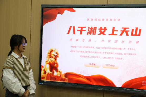23级张建敏同学,她将演讲重点放在了“八千湘女上天山”这一故事上,在新中国成立初期,新疆亟待开发建设。为了巩固边防、建设新疆,国家发出号召,动员广大女青年支援新疆。征兵团在长沙各处宣传,一时间,“到新疆去,到祖国最需要的地方去!”成为湘女们的梦想。去往新疆的路上到处是困难,但湘女们却没有放弃,坚实的扎根在我国的边缘,为祖国的新疆建设做出了傲人的功绩,她们自豪的将自己的一生都奉献给了新疆。