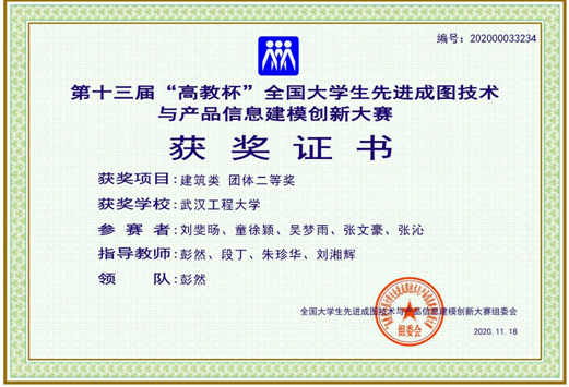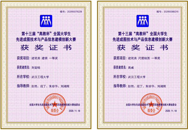 学院建筑学与城乡规划系在2017级和2018级本科生中选拔了10名优秀学生选手参加了该项赛事的建筑类团体竞赛和个人单项竞赛,指导老师为彭然、段丁、朱珍华、刘湘辉,领队老师为彭然。最终学院不仅荣获了该赛事的团体二等奖,参赛的10名选手还全部荣获了个人单项奖,可谓是“十全十美”。其中2017级城乡规划专业刘斐旸获得了建模类全国一等奖,2017级建筑学专业黄威获得了尺规类全国一等奖,这也是学院继2019年后第二次参加该项赛事并再次收获建筑类奖项的大满贯。