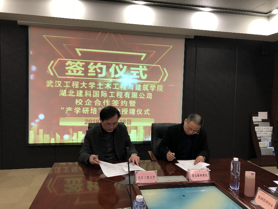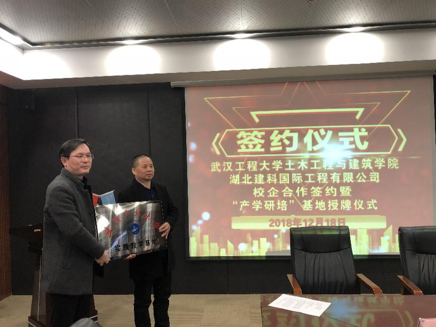 会谈期间,我院与湖北建科国际工程有限公司共同签署了院企合作协议,并举行了“产学研陪”实习基地授牌仪式。