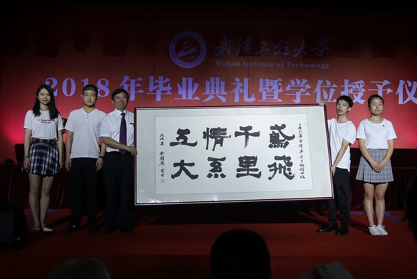 校党委书记程幼金接收了来自学生们给母校的献礼。考入清华大学的涂瑞同学、考入北京大学的贾天蛟同学、就职于天津凯莱英医药集团的文良松同学和志愿赴西藏山南支边的何洪诚同学作为2018届全体毕业代表上台献礼。这份来自学生们的心意是毕业生亲手书写的书法作品:“鸢飞千里,情系工大”,寓意无论毕业生去往何处,心永远与母校相连。