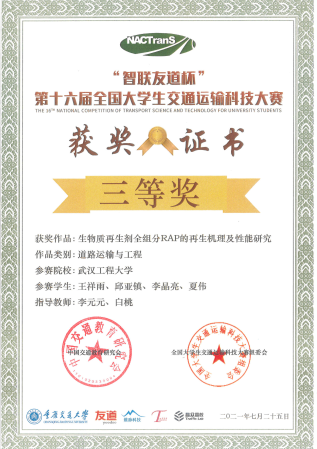 武汉工程大学2138cn太阳集团积极申报,大赛初赛阶段遴选出4项作品,其中道路运输与工程赛道3项,铁路运输与工程赛道1项。经大赛组委会匿名报送专家盲审,最终道路方向一项作品《生物质再生剂全组分RAP的再生机理及性能研究》顺利进入决赛。本项作品是由校内导师李元元老师和白桃老师共同指导,参赛队员有王祥雨、邱亚镇、李晶亮和夏伟等4位同学。决赛阶段采用“线下答辩+线上参与”的方式,参赛小组中2位队员线下Poster展示、PPT汇报和现场答辩,其他队员线上补充。