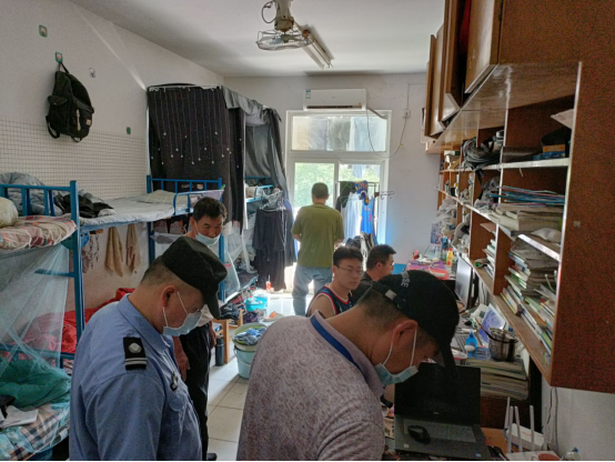 在男生宿舍5栋,保卫处工作人员与辅导员一同深入排查了学生宿舍的用电安全情况,对私拉乱接电线、堵塞消防通道等各类消防安全隐患进行了认真细致的检查,并以学校最近某寝室发生火险为例,提醒大家要坚决杜绝使用违章电器,一定要使用符合安全标准的插线板、充电线,做到人走断电,切实保障自身生命财产安全。
