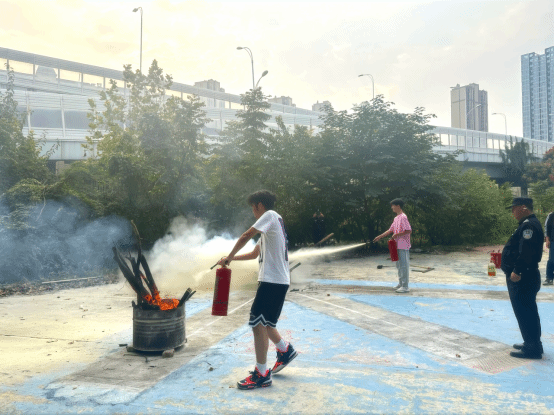 在了解各种消防设备的基本知识和使用方法后,学校保卫处设置了火源点,模拟真实的火灾情况。同学们积极踊跃、兴致高昂,按照示范动作认真使用灭火器材对现场设置的小型模拟火堆进行灭火实操演练。演练过程中,学校保卫处时刻关注同学们的操作技巧和反应速度,及时给予指导和纠正。通过多次的实操演练,同学们逐渐熟悉了灭火器的操作,增强了应对火灾紧急情况的能力。