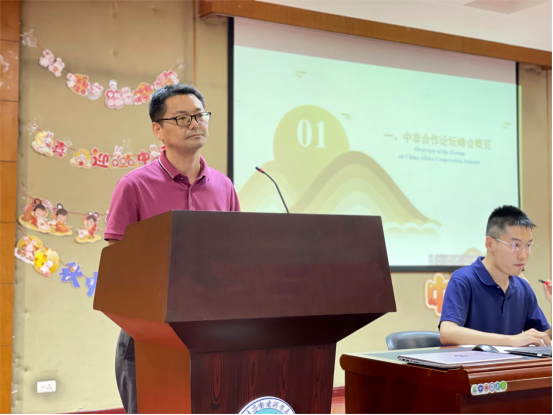 桂展鹏详细解读了习近平主席在中非合作论坛北京峰会开幕式上的主旨讲话——《携手推进现代化,共筑命运共同体》,他指出习近平主席的主旨讲话为深化中非团结合作擘画新蓝图,开辟新路径,为中非共逐现代化之梦提供新机遇、注入新动能;希望中外学生博学广志,不负韶华,做优秀文化的传播者,为促进民心相通、推动构建人类命运共同体贡献力量。