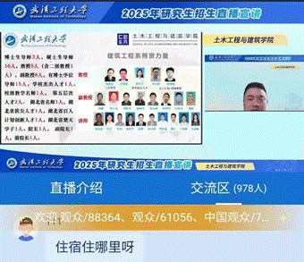 与此同时,线上宣讲活动也同步展开,通过网络直播面向全国学子。彭然、谢莎莎、万九鸣、王慧妮等老师参与了此次线上宣讲,他们围绕学校的校园环境、学院的学科研究方向和学术资源等展开介绍,并结合当前考研趋势,详细讲解了报考流程、复习策略、导师选择等实用信息。直播中,师生互动热烈,讲师们耐心解答了学生的疑问,进一步增强了大家的备考信心,加深了广大青年学子们对武汉工程大学及2138cn太阳集团的了解。